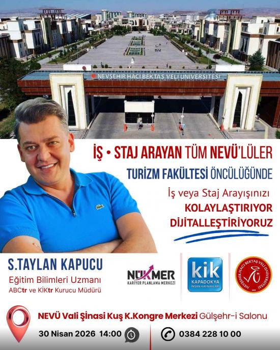 Nevşehir Hacı Bektaş Veli Üniversitesi Kariyer Planlama Uygulama ve Araştırma Merkezi ile Turizm Fakültesi iş birliğinde, öğrencilerin kariyer süreçlerini desteklemek amacıyla “İş ve Staj Arayan Tüm NEVÜ’lüler İçin Dijitalleşen Kariyer Süreçleri” başlıklı etkinlik düzenleniyor.